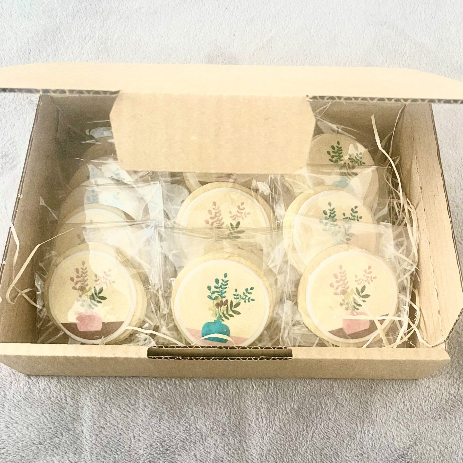 La caja contiene 15 galletas de mantequilla de 6,5cm decoradas con papel de azúcar impreso.