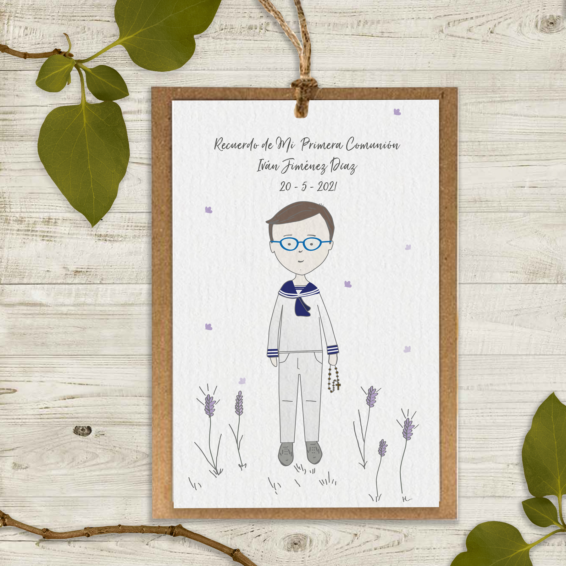 Recordatorio impreso en papel verjurado blanco de 240gr. con trasera de Kraft