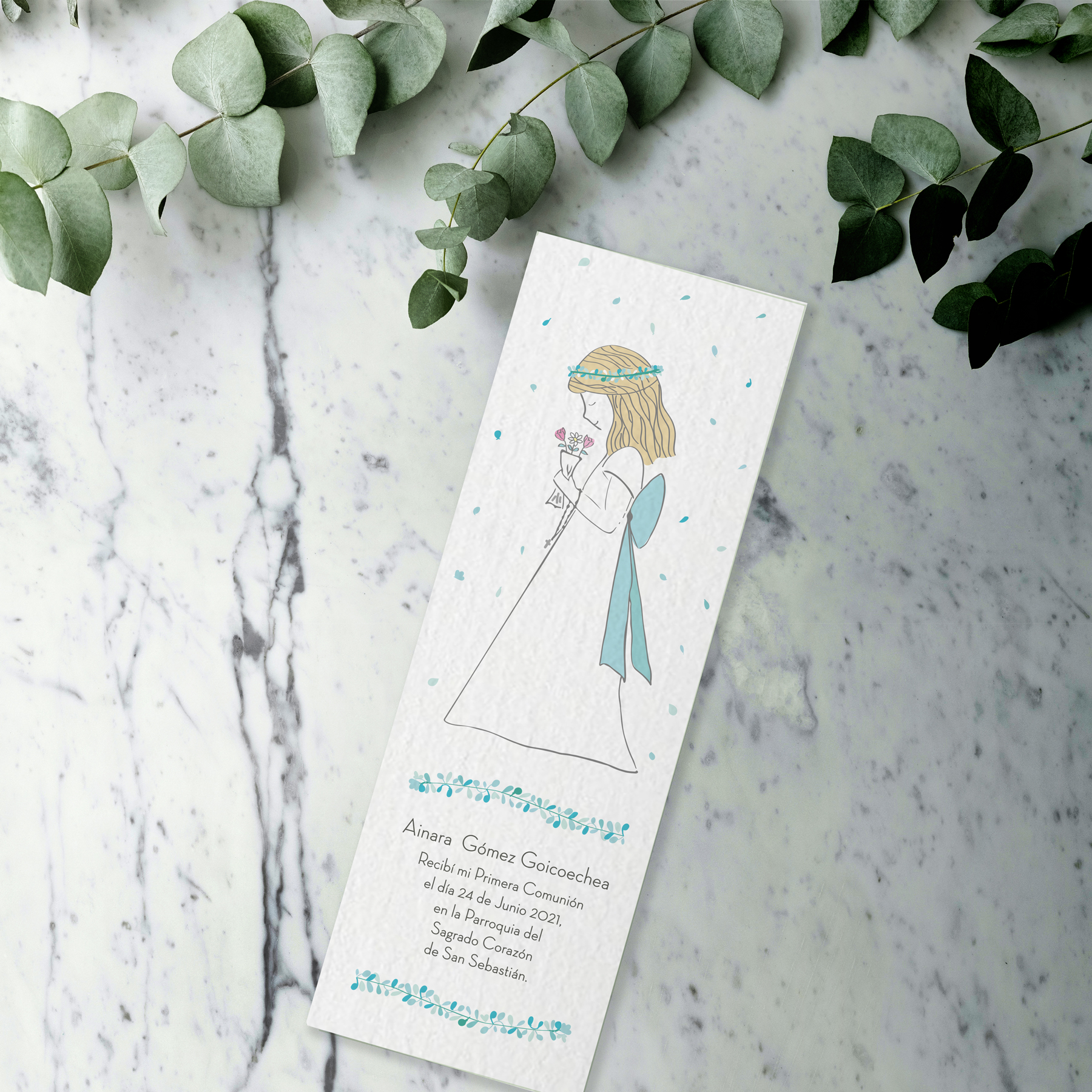 Recordatorio marcapáginas impreso en papel verjurado blanco de 240gr. Acabado con un cordón.