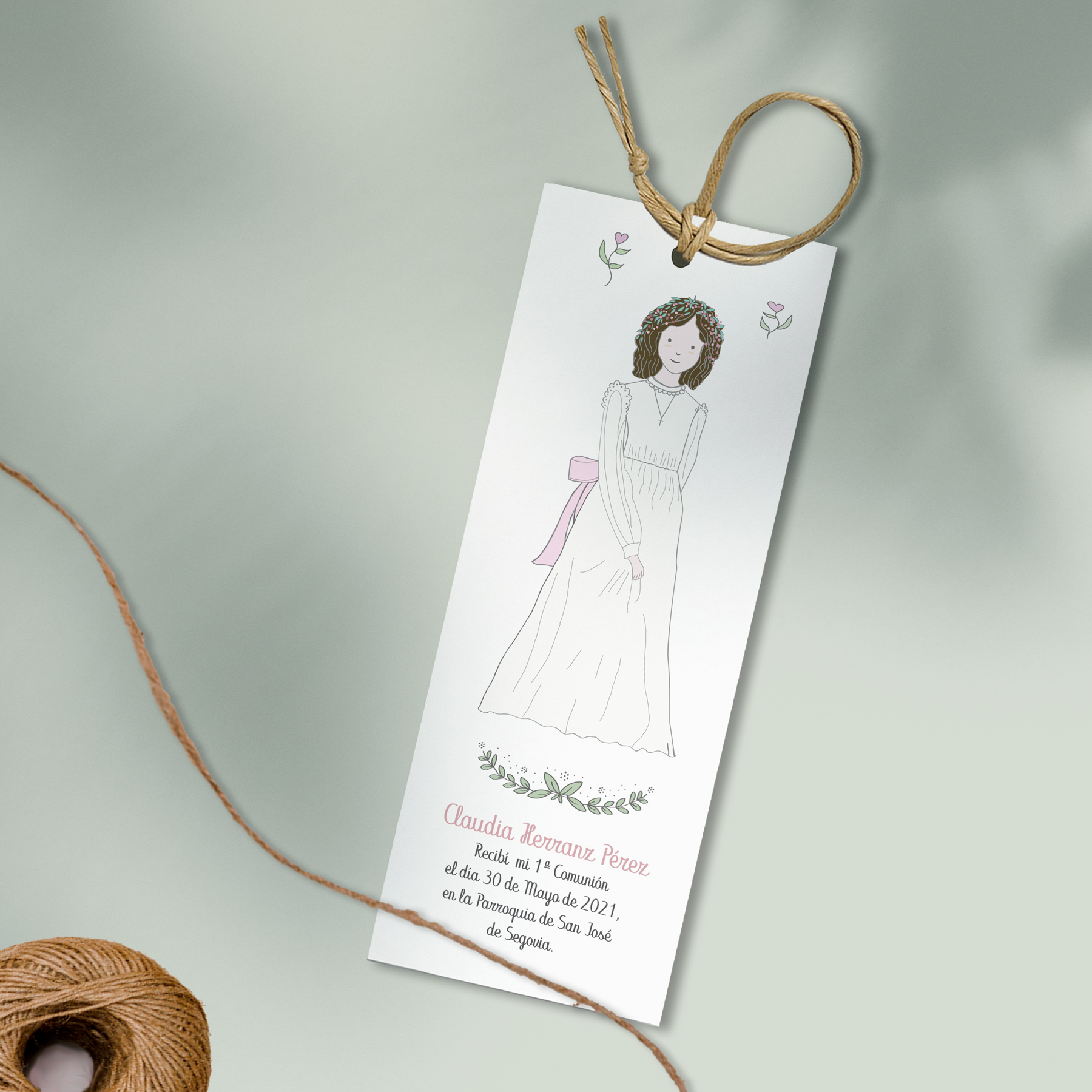 Recordatorio marcapáginas impreso en papel verjurado blanco de 240gr. Acabado con un cordón.