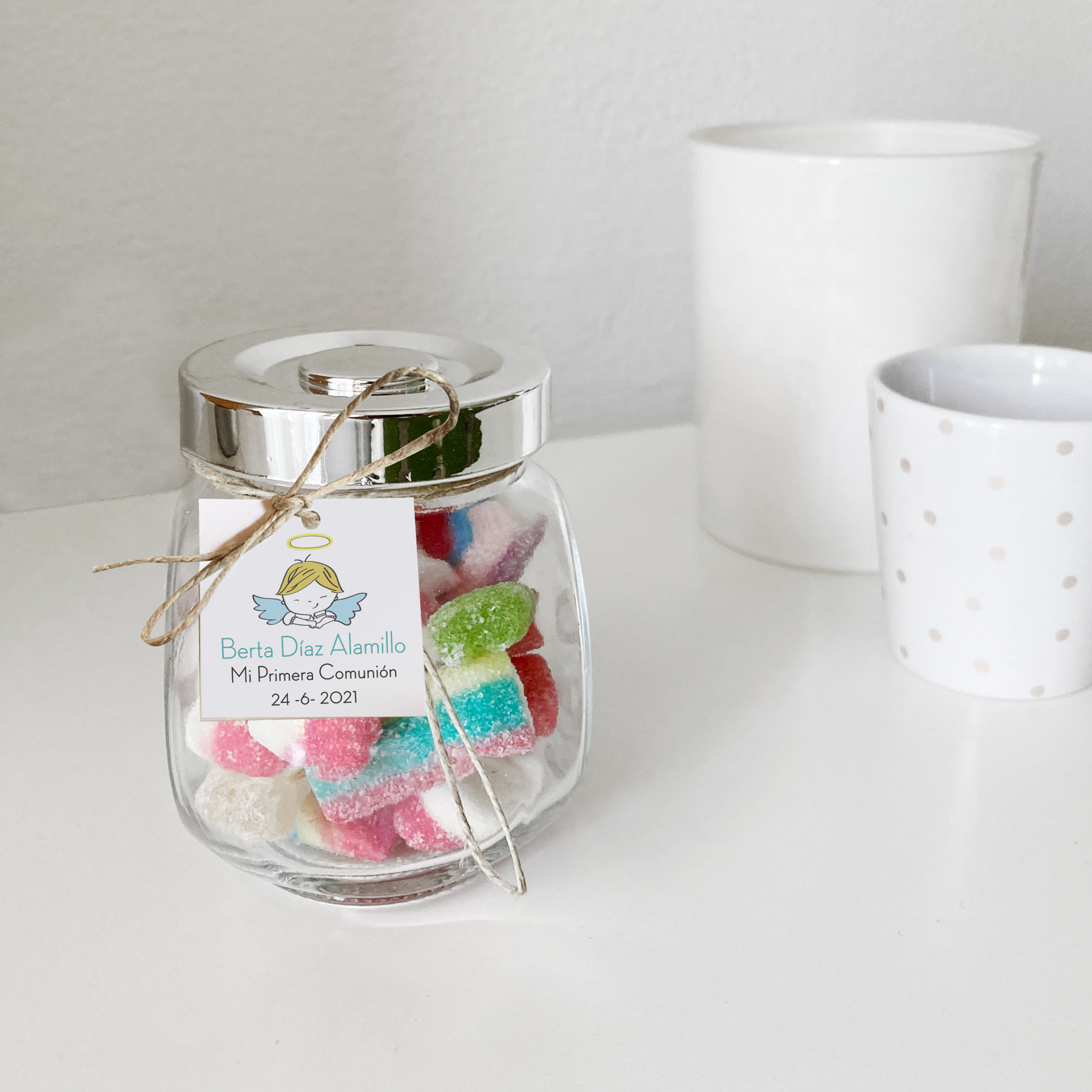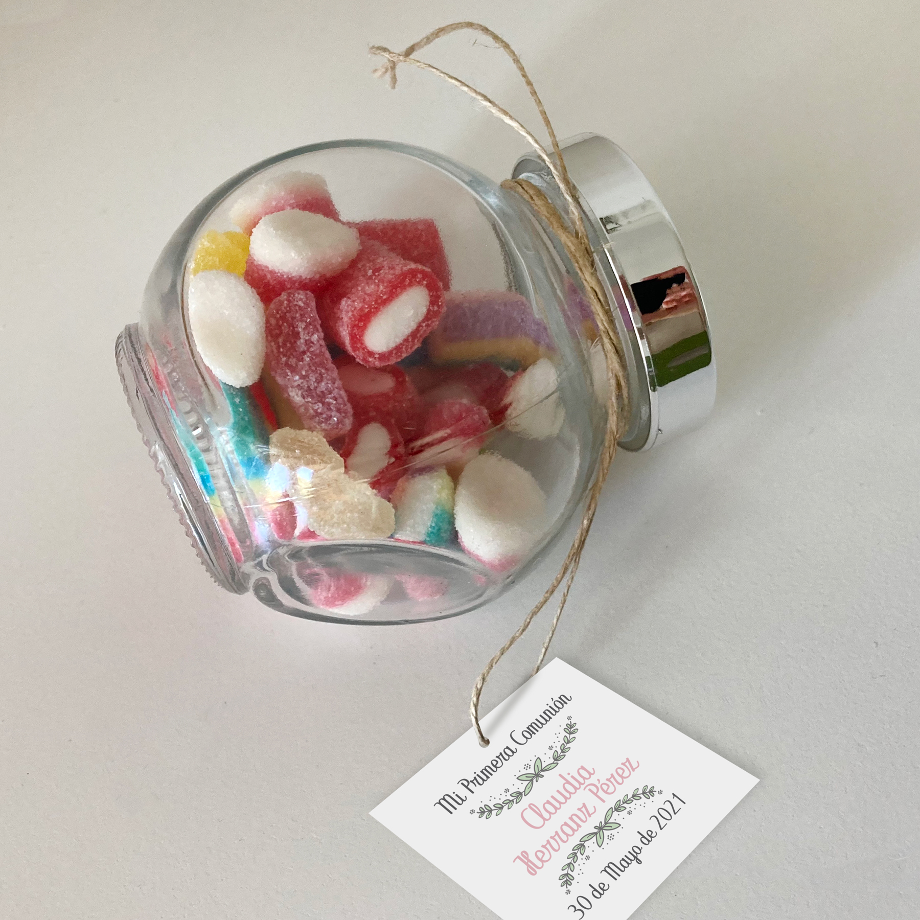 Tarrito de cristal personalizado con chuches variadas.